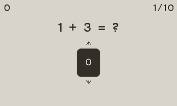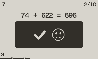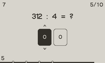 Pick a mode and work through ten problems. Start with simple addition and subtraction, and work your way up to mixed operations with numbers up to 1000. Turn the crank to set your answer, hit A to confirm.